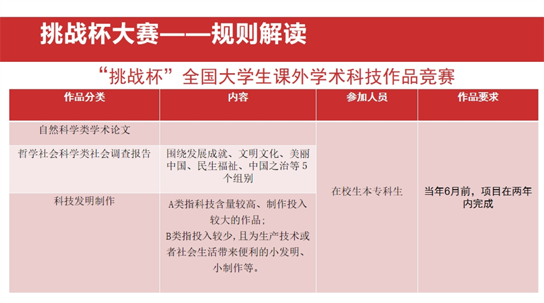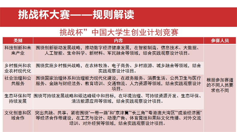 她提到,挑戰(zhàn)杯大賽分為“挑戰(zhàn)杯”中國大學(xué)生創(chuàng)業(yè)計劃競賽(小挑)和“挑戰(zhàn)杯”全國大學(xué)生課外學(xué)術(shù)科技作品競賽(大挑)兩大并列賽事。兩大賽事各有不同的參賽類別和側(cè)重點(diǎn)。其中,“大挑”側(cè)重于學(xué)術(shù)科技發(fā)明創(chuàng)作的實(shí)際意義與特點(diǎn),考察學(xué)生的科技創(chuàng)新能力及社會問題關(guān)注與解決能力;而“小挑”更強(qiáng)調(diào)市場與技術(shù)服務(wù)的結(jié)合,側(cè)重于考察參賽者的商業(yè)敏感度和商業(yè)運(yùn)作能力。