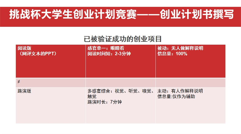 針對創(chuàng)業(yè)計劃書的撰寫,王冬梅副教授從內(nèi)容構(gòu)成、呈現(xiàn)重點(diǎn)等方面進(jìn)行了細(xì)致講解。她談到,在網(wǎng)評階段與路演階段,評委在感官、閱讀時長、信息了解度等方面存在著差異,建議創(chuàng)業(yè)計劃書的PPT版本根據(jù)不同階段進(jìn)行適當(dāng)調(diào)整。例如,網(wǎng)評PPT版本應(yīng)控制在40-60頁之間,而路演版本則應(yīng)精簡至20頁左右。