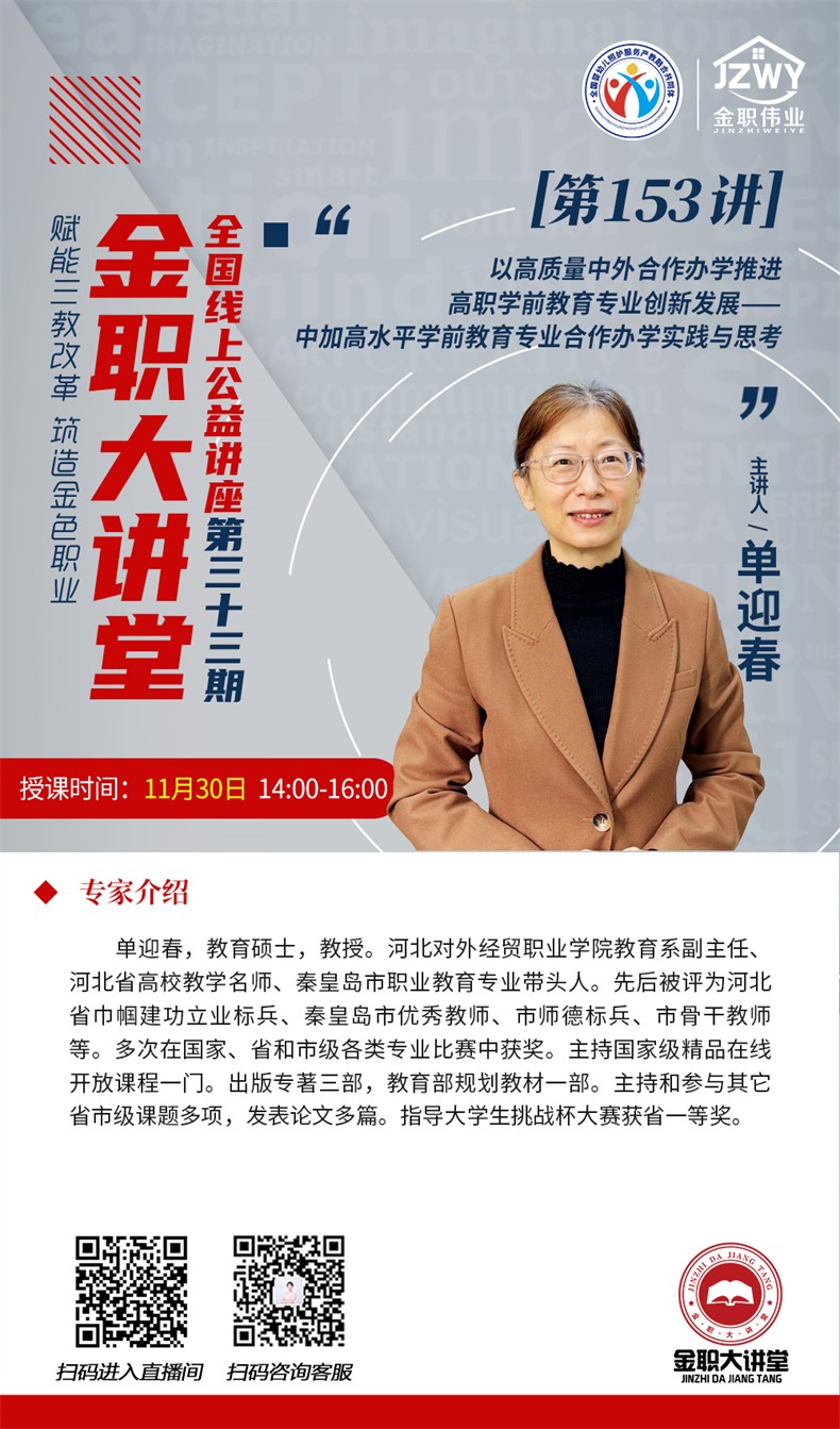 11月30日,金職大講堂將開啟第三十三期第153講,課程將邀請河北對外經(jīng)貿(mào)職業(yè)學(xué)院單迎春教授,進(jìn)行《以高質(zhì)量中外合作辦學(xué)推進(jìn)高職學(xué)前教育專業(yè)創(chuàng)新發(fā)展——中加高水平學(xué)前教育專業(yè)合作辦學(xué)實(shí)踐與思考》主題授課。