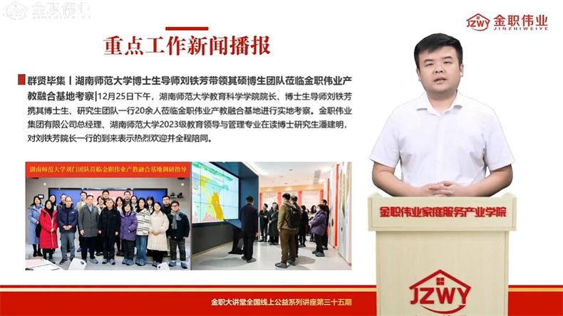 1月4日,金職大講堂第158講開講。課程邀請到2024年世界職業院校技能大賽總決賽爭奪賽嬰幼兒健康養育照護賽項一等獎參賽隊指導教師,湖南民族職業學院李佳佳副教授作《世校賽嬰幼兒健康養育照護賽項經驗分享》主題授課。
