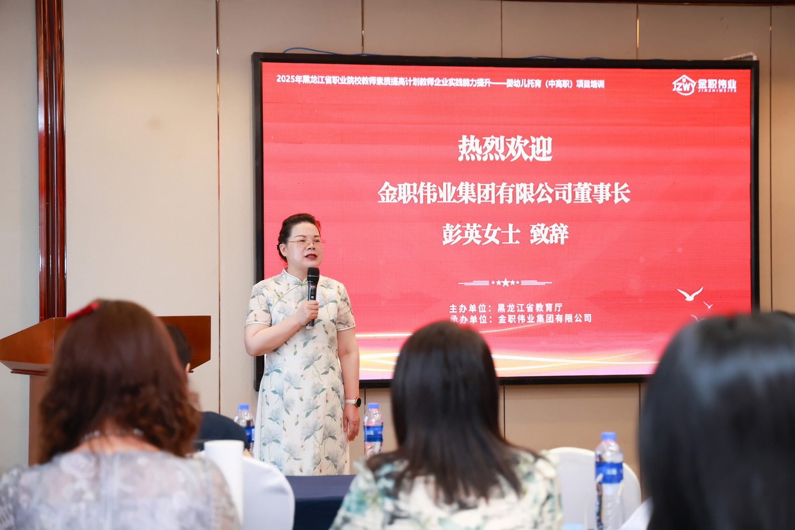 金職偉業(yè)集團(tuán)有限公司董事長(zhǎng)彭英女士發(fā)表致辭。她指出,嬰幼兒托育行業(yè)關(guān)系到嬰幼兒的健康成長(zhǎng),關(guān)系到家庭的幸福和社會(huì)的和諧發(fā)展,而職業(yè)院校教師作為該領(lǐng)域人才培養(yǎng)的重要力量,其專業(yè)能力的提升至關(guān)重要。她希望各位學(xué)員能夠在培訓(xùn)中有所收獲,將所學(xué)知識(shí)運(yùn)用到今后的教學(xué)工作中,為推動(dòng)?jì)胗變和杏袠I(yè)的發(fā)展貢獻(xiàn)力量。