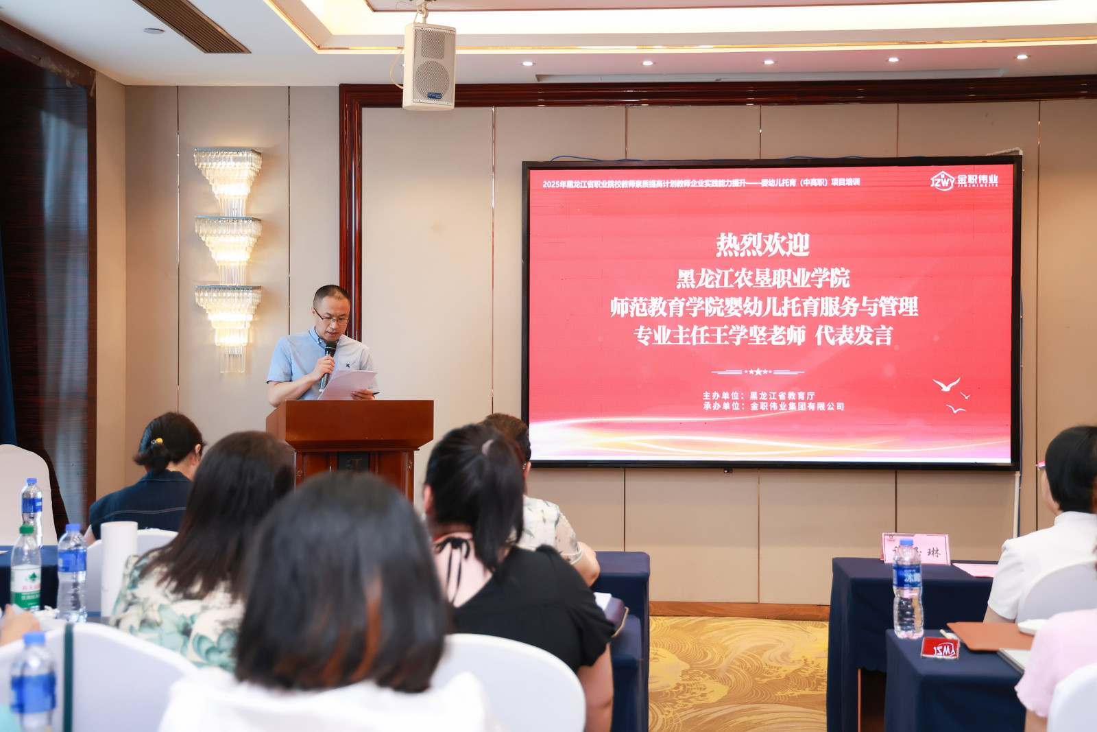 黑龍江農(nóng)墾職業(yè)學(xué)院師范教育學(xué)院嬰幼兒托育服務(wù)與管理專業(yè)主任王學(xué)堅(jiān)作為學(xué)員代表發(fā)言,他對(duì)金職偉業(yè)集團(tuán)提供了一個(gè)提升嬰幼兒托育實(shí)踐能力的寶貴平臺(tái)表示感謝。他表示,全體學(xué)員將珍惜此次培訓(xùn)機(jī)會(huì),嚴(yán)格遵守培訓(xùn)紀(jì)律,認(rèn)真聆聽每一堂課,積極參與交流研討,努力將所學(xué)知識(shí)與實(shí)踐相結(jié)合,切實(shí)提升自身的專業(yè)素養(yǎng)和教學(xué)能力。