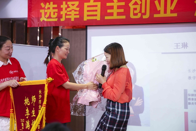 結(jié)業(yè)現(xiàn)場,學(xué)員們還自發(fā)地將一面面代表心意的錦旗及一束束鮮花贈予授課講師及金職偉業(yè)學(xué)校,以表對學(xué)校、老師的感恩之情。執(zhí)行校長陳波、教研經(jīng)理李姁鋮、就業(yè)主管閆文杰、教務(wù)班主任劉青青、熊燦玲出席了結(jié)業(yè)典禮。