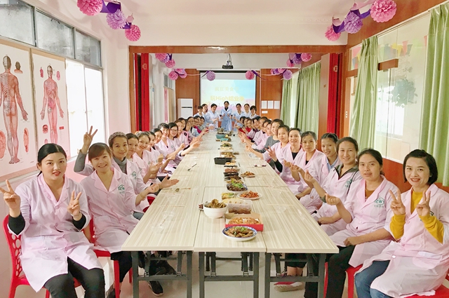 結業典禮的首個活動流程是美食分享會,第8期小兒推拿保健師班、12期產后康復師班、16期母嬰護理師班、19期母乳喂養指導師班全體師生在教室集中,分享大家自制的美食。