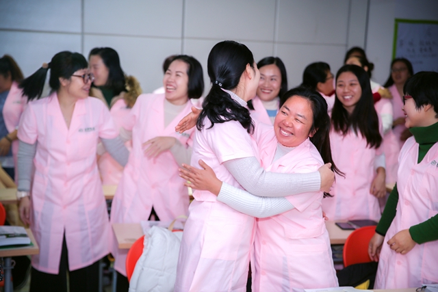 作為職業(yè)心理咨詢師,陳波校長還提議學(xué)員們起立擁抱身邊的人,敞開心扉,感恩遇見,會有不一樣的收獲。學(xué)員們紛紛響應(yīng),熱情擁抱身旁的姐妹,燦爛的笑容洋溢在每個人的臉上,整個教室都變得更加溫暖。