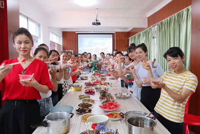 全體師生在學校教室一起分享各自帶來的美食,歡度夏至。