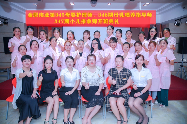 9月8日,長沙市金職偉業職業培訓學校345期月嫂班、346期催乳師班、347期小兒推拿班三個班一起舉行開班典禮。來自湖北、江西、貴州、湖南等全國各省市的學員齊聚長沙,為學習專業的母嬰服務技能而努力。