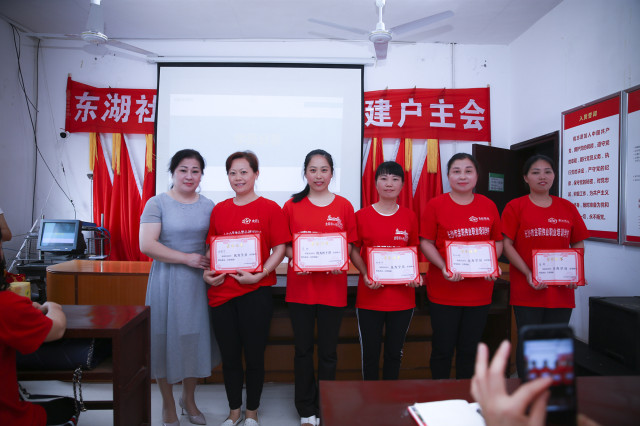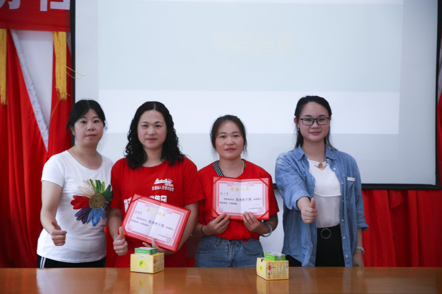 喻愛華、諶群、肖陽、易燦群、楊彩洪作為“優秀學員”上臺領獎。五人均十分激動,相繼感謝了東湖塘鎮政府、金職偉業學校與老師。學員楊彩洪表示自己收獲到的不止是專業知識,更有姐妹情深。