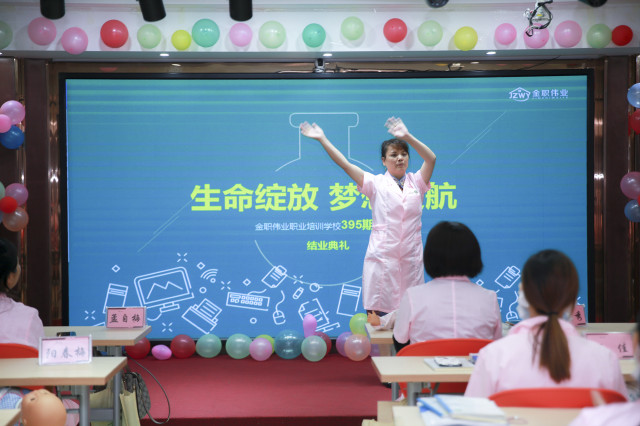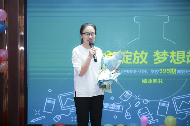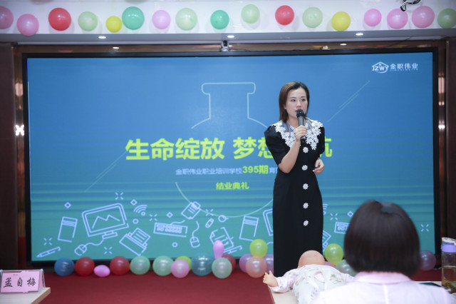 ?此次結(jié)業(yè)典禮由金職偉業(yè)教務(wù)班主任閆文杰老師主持,金職偉業(yè)大市場(chǎng)總監(jiān)周娟、培訓(xùn)學(xué)校校長(zhǎng)楊珺安、母嬰護(hù)理資深講師徐玲、教務(wù)班主任黃靜、劉青青等出席并發(fā)言。