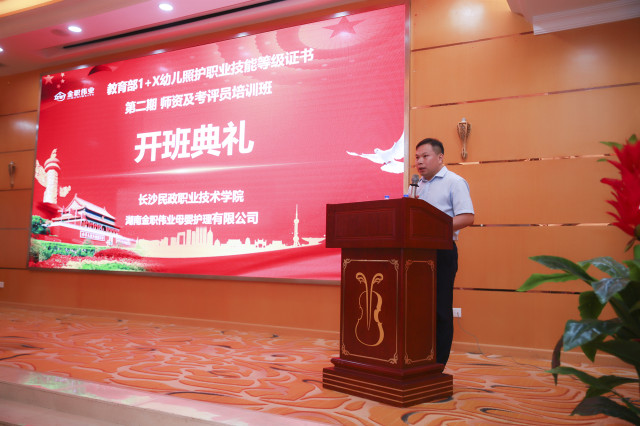 典禮伊始,湖南省教育廳職業教育與成人教育處科長劉彥奇率先發表致辭。“幼兒照護是一份偉大的事業,只有把幼兒照護做好,才能為全面二孩政策落地保駕護航”。劉彥奇講話中指出,目前在推進的幼兒照護職業技能等級證書試點工作,是十分有意義的。對于大家疫情期間,仍從全國各地趕至湖南參加培訓,他表示十分感動和分外歡迎。劉彥奇表示,長沙民政職業技術學院和金職偉業的強強聯合,一定會將“1+X幼兒照護”職業技能等級證書師資及考評員培訓落地服務做好做精。