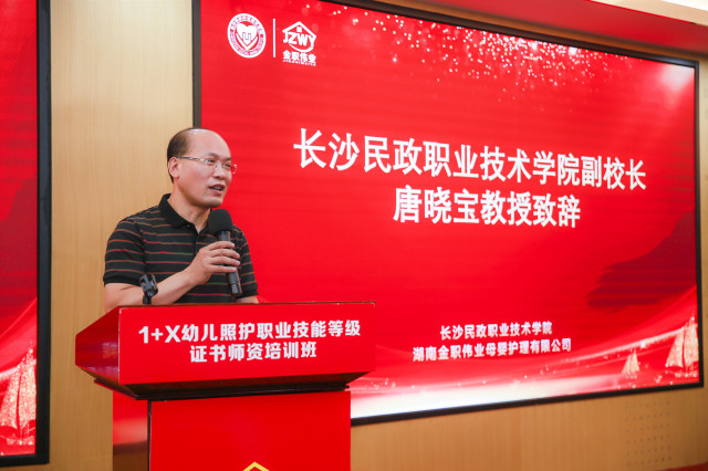 長沙民政職業技術學院副校長唐曉寶教授發表致辭。他表示幼兒照護職業技能等級證書能為學前教育、兒童保健、護理等專業學生進入該領域創造有利的條件,而長沙民政職業技術學院作為全國首批職業教育1+x證書制度推進試點單位,一定會大力支持金職偉業的培訓工作,希望參與培訓的專家老師能夠加強溝通、交流,為職業教育的美好明天做出新的貢獻。