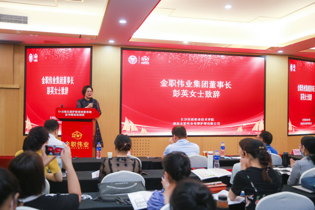 最后,湖南金職偉業現代家庭產業發展有限公司董事長彭英發表講話。首先她表示,在今后金職偉業將繼續發揮行業龍頭企業的示范引領作用,帶動更多托育、學前等領域企業高質量發展,并希望今后能夠與各位攜手,實現學生好學、老師好教、企業好用的偉大目標。最后,她強調會充分發揮幼兒照護等級證書對學校、教師、學生的作用,實現國家職業教育的改革與創新。