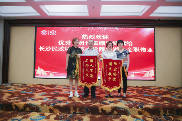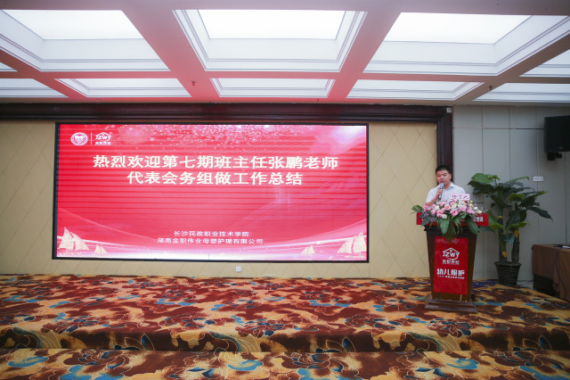 教育部第三批1+X幼兒照護項目第七期班主任張鵬上臺對于培訓期間的工作進行總結。隨后,優秀學員代表為長沙民政職業技術學院及金職偉業集團送上錦旗,以表深厚謝意及崇高敬意。