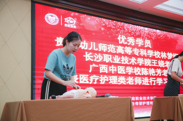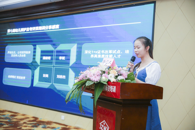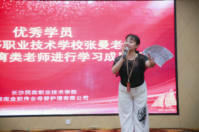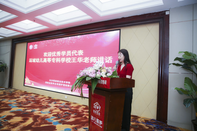 來賓職業教育中心學校楊驗頔老師、運城幼兒高等專科學校王華老師作為優秀學員代表上臺發言。她們均表示此次來到長沙參與幼兒照護師資及考評員培訓收獲滿滿、不虛此行,也表示此次培訓對于回校之后學生拓寬思路、實現多途徑就業有重要意義。
