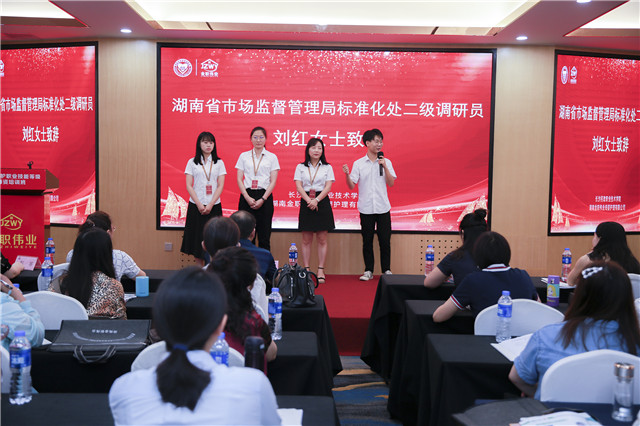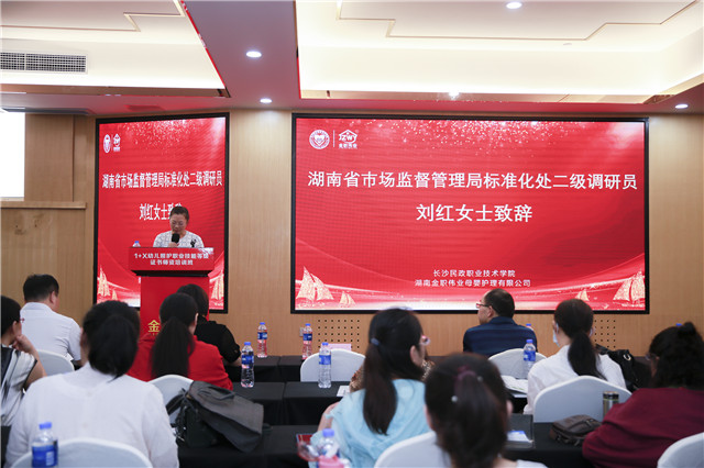 湖南省巿場監督管理局標準化處二級調研員劉紅首先進行致辭。她在講話中提到,“國家啟動1+x證書試點工作,主要目的就是進一步發揮好學歷證書作用,夯實學生可持續發展基礎,同時通過院校內實施的職業技能等級證書培訓提升職業活動和個人職業發展所需的綜合人力。”