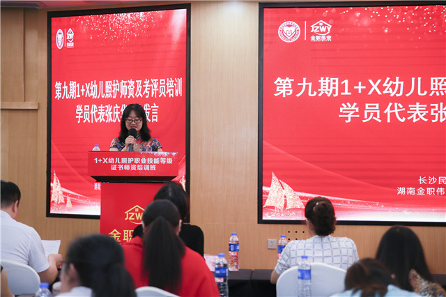 重慶青年職業技術學院學前教育學院副院長張慶華老師作為優秀學員代表進行分享。她表示大家因為一個共同的目標相聚在此,這是一次有意義的培訓,她呼吁大家應該珍惜來之不易的學習機會,并表示希望通過之后的學習,能對于幼兒照護1+x證書的標準解讀、實施方案有一個更加清晰的了解與掌握。