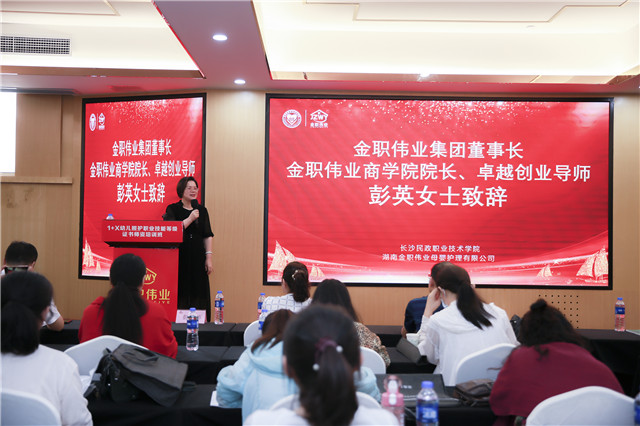 最后,湖南金職偉業現代家庭產業發展有限公司董事長彭英發表講話。她從三個方面進行了分享,其一,金職偉業將繼續發揮好行業龍頭企業的示范引領作用,帶動更多托育、兒童保健、學前等領域企業規范發展、規模發展、質量發展;其二,金職偉業將不遺余力推動“1+X幼兒照護”等級證書制度落地,為獲得X證書的學生搭建更多更廣的就業創業平臺;其三,她也號召有條件有需求的企業多拿出一些資源對學生群體加強就業、創業扶持,幫助他們更好地發展。