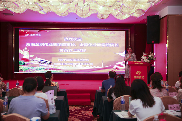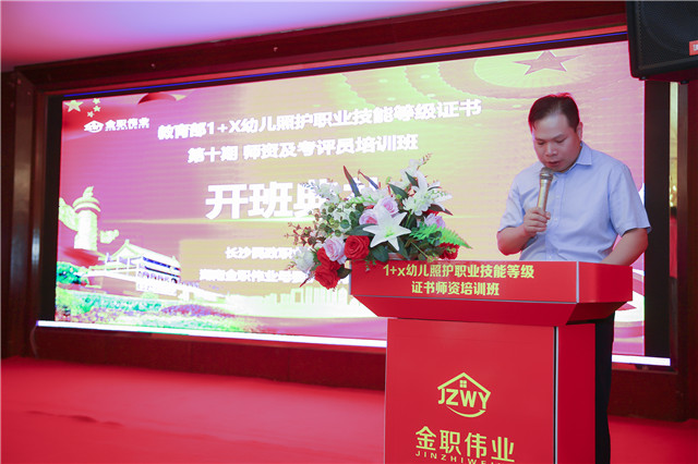 最后,湖南金職偉業集團董事長彭英進行致辭。她首先對各位領導、專家老師的到來表示熱烈歡迎,并就此次師資開班分享了三點內容:其一,黨的好政策,金職人在路上。在國家教育、人才、產業政策的大力支持下,金職偉業迎來了發展的春天,希望今后能夠與各位攜手,實現學生好學、老師好教、企業好用的偉大目標。其二,充分發揮幼兒照護等級證書對學校、教師、學生的作用,實現國家職業教育的改革與創新。其三,作為國家教育部1+x幼兒照護職業教育培訓評價組織,金職偉業將會繼續發揮龍頭企業的示范性作用,帶動更多的托育、兒童保健、學前等領域的企業發展,并不留余力地推動1+x幼兒照護等級證書制度的落地,號召有條件、有需求的企業進行資源對接,加強對學生群體就業、創業的扶持。最后,彭總表示在今后金職偉業將以專業、創新、貼心、感恩的企業精神及讓千萬婦幼老實現健康幸福生活的企業使命,開啟中國夢、金職夢、創業夢。