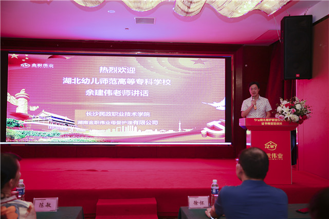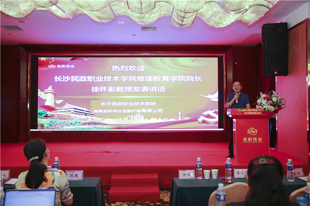 長沙民政職業技術學院繼續教育學院院長徐懷副教授發表講話。他在講話中提到“金職偉業作為1+x幼兒照護職業技能等級證書的評價組織機構,通過調動幼兒照護領域內骨干企業資源和院校資源,聯合研制‘幼兒照護’職業技能等級標準,促進幼兒照護領域相關理論和技能加快形成,為推動健全完善1+x幼兒照護行業服務標準規范提供了工作準備。”