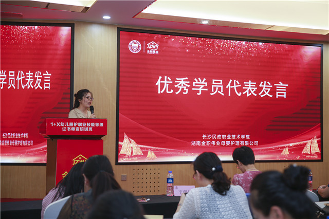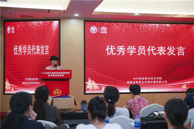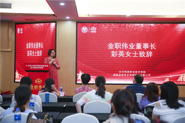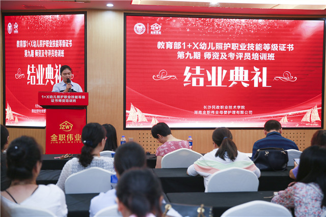 金職偉業集團董事長彭英女士發表結業致辭。她首先感謝教育部的大好政策,讓金職偉業能夠入圍第三批1+X職業教育培訓評價組織,同時對于各位專家教授從全國各地奔赴長沙參與此次培訓表示感謝。“在今后,金職偉業將借助1+x平臺、利用這個絕佳契機,不留余力地完善、創新幼兒照護領域的標準、課程、服務、教材體系,并積極落地‘1+x’幼兒照護課程實訓基地的建設。”最后,她呼吁各位專家、老師在回校之后積極推動幼兒照護事業的實施落地。