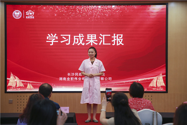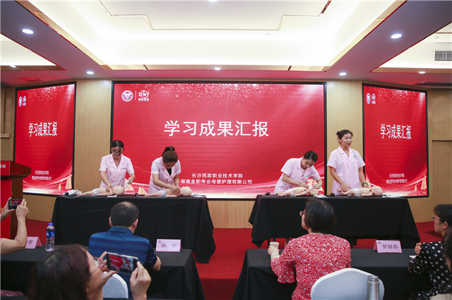長沙民政職業技術學院繼續教育學院院長徐懷,湖南金職偉業集團董事長、金職偉業商學院院長、卓越創業導師彭英,湖南省勞動和社會保障廳民辦職業培訓機構督導評估專家敬曉青,湖南金職偉業母嬰護理有限公司幼兒照護技術負責人李偲婧等出席結業典禮。本次結業典禮由重慶朗萌巴蜀教育集團鐘亞玲園長主持。