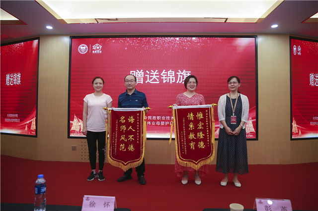 遼陽職業技術學院李瑩老師、貴州省遵義市職業技術學校劉念老師作為學員代表向長沙民政職業技術學院和金職偉業集團贈送錦旗。