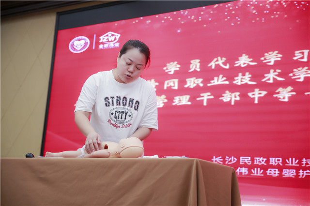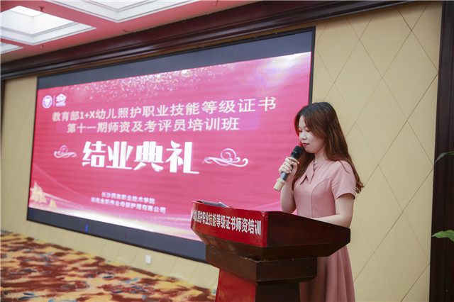 結業典禮上,黃岡職業技術學院王偉老師、賀州市經濟管理干部中等專業學校黃碧靈老師、阿米嬰童學苑郭涵老師,作為學員代表進行實操及考評演示,她們動作標準、話術專業,展現出1+x幼兒照護職業技能等級證書考評員的無限風采。