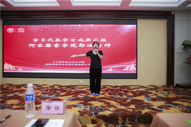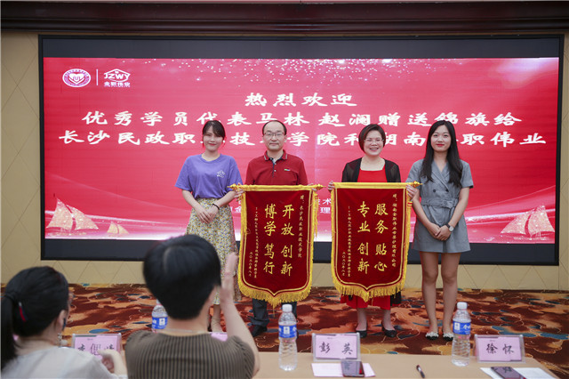 隨后,本期優秀學員代表為長沙民政職業技術學院及湖南金職偉業集團贈予錦旗。