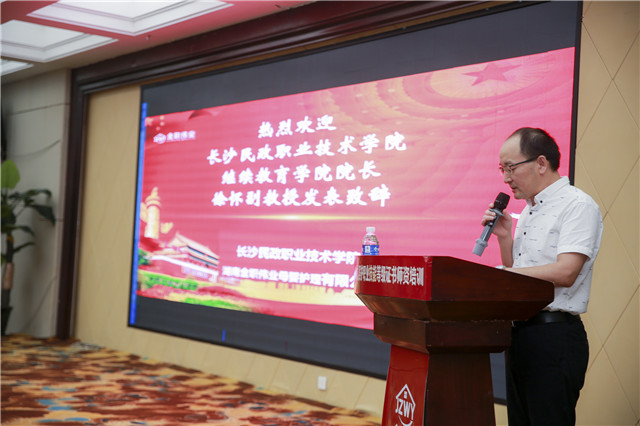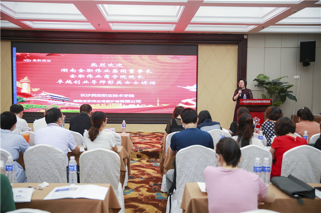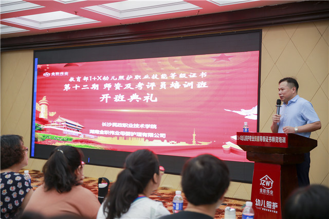 湖南金職偉業現代家庭產業發展有限公司董事長彭英發表致辭。她強調金職偉業在今后將不遺余力推動“1+X幼兒照護”等級證書制度落地,為獲得X證書的學生搭建更多更廣的就業創業平臺,號召有條件有需求的企業多拿出一些資源對學生群體加強就業、創業扶持,幫助他們更好地發展,也希望各位專家老師在培訓期間能夠學有所獲、學有所得。