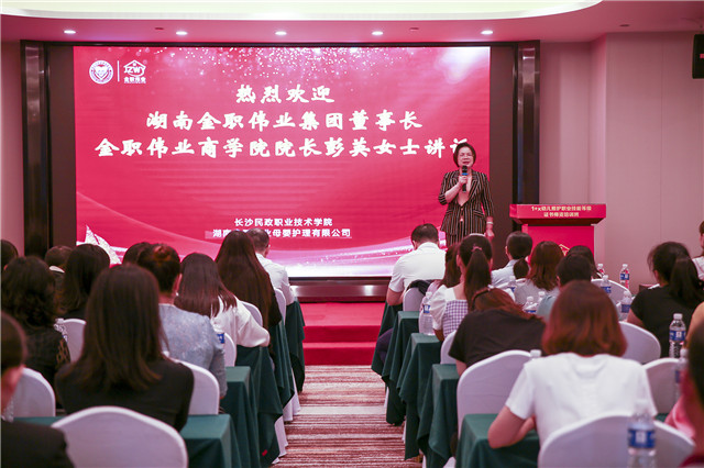 金職偉業集團董事長彭英發表講話,她表示,經過此次培訓,在座各位老師成為了幼兒照護的“引路人”和“守門人”,多了份使命和責任,同時提到,“金職偉業將借助1+x平臺、利用這個絕佳契機,不留余力地完善和創新幼兒照護領域的標準、課程、服務、教材體系,并積極落地‘1+x’幼兒照護課程實訓基地的建設,協助各大院校逐步推進‘1+x’證書制度試點工作,多措并舉促進‘書證融通’,全面深化教師、教材、教法‘三教’改革,不斷探索幼兒護照職業技能等級證書落地各大職業院校、應用型本科高校的方法模式”。最后她希望各位老師在回校之后能積極推動幼兒照護事業的實施和落地。