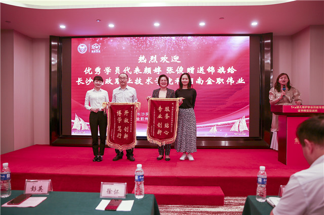 隨后,本期優秀班干部代表為長沙民政職業技術學院及湖南金職偉業集團贈予錦旗。
