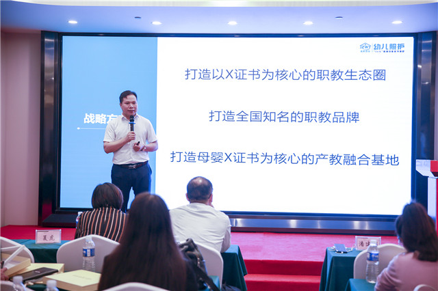 最后,湖南省育嬰師協會會長、湖南金職偉業現代家庭產業發展有限公司總裁潘建明做總結發言,他提出了以下幾點戰略方向:其一,打造以X證書為核心的職教生態圈。其二,打造全國知名的職教品牌。其三,打造母嬰X證書為核心的產教融合基地。最后,他希望每位老師在返校后能盡快制定落地方案,共同攜手,凝心聚力培養好14萬優秀學子。