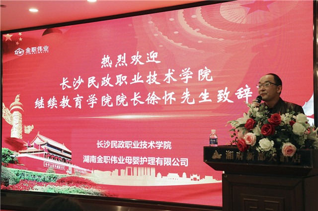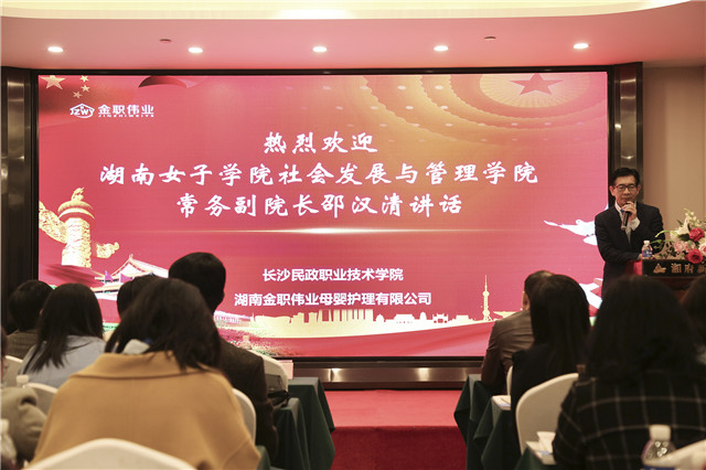 典禮由湖南省育嬰師協會會長、湖南金職偉業現代家庭產業發展有限公司總裁潘建明主持,長沙民政職業技術學院繼續教育學院院長徐懷,湖南女子學院社會發展與管理學院常務副院長、國際注冊家政企業管理師、湖南省早期教育研究會常務理事、湖南省民政廳專家咨詢委員會委員邵漢清,湖南金職偉業集團董事長、金職偉業商學院院長、卓越創業導師彭英,湖南省勞動和社會保障廳民辦職業培訓機構督導評估專家敬曉青等出席。