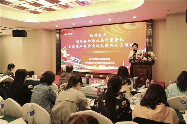 最后,湖南金職偉業集團董事長彭英進行總結講話,她從三個方面進行了分享,其一,金職偉業將繼續發揮好行業龍頭企業的示范引領作用,帶動更多托育、兒童保健、學前等領域企業規范發展、規模發展、質量發展;其二,金職偉業將不遺余力推動“1+X幼兒照護”等級證書制度落地,為獲得X證書的學生搭建更多更廣的就業創業平臺;其三,她也號召有條件有需求的企業多拿出一些資源對學生群體加強就業、創業扶持,幫助他們更好地發展。