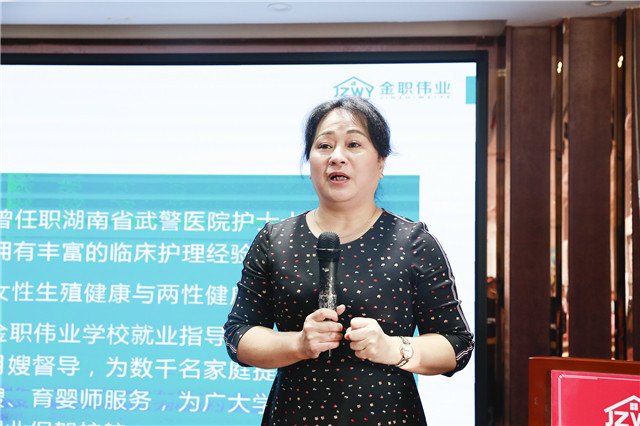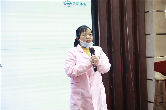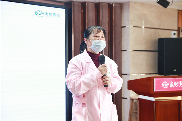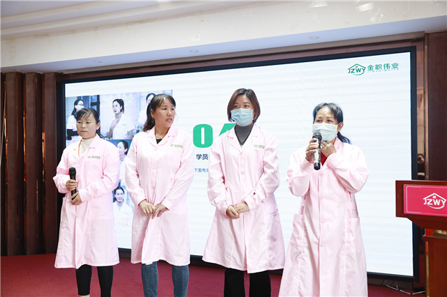 隨后,金職偉業資深講師陳蕾瓊作為優秀師資代表上臺進行發言。她希望學員們在培訓期間能夠認真學習,在今后始終懷以愛心、耐心、專心、責任心去上崗就業,最終實現幸福生活。