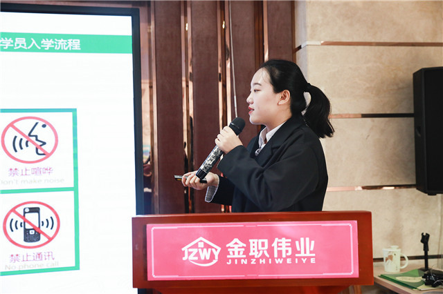 金職偉業職業規劃師李倩葉老師為學員們介紹了金職偉業集團的發展歷程與基本框架。教務班主任曾亞梅老師則詳細地講解了本次培訓相關的教務制度、考勤管理、實習住宿等內容。