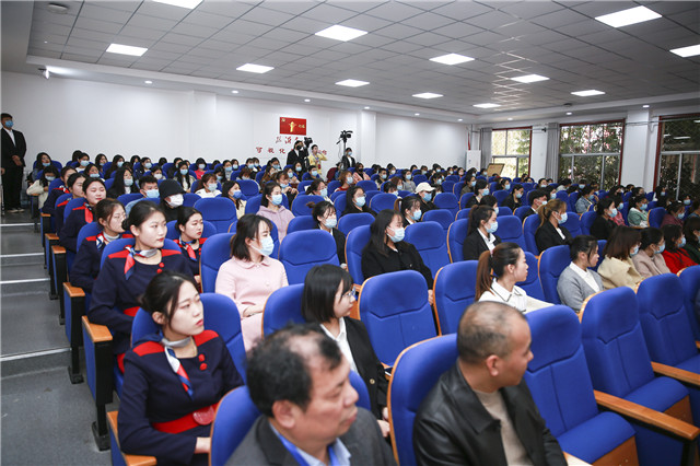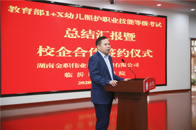 11月9日下午,首考總結表彰會暨校企合作簽約儀式在山東臨沂職業學院美術館報告廳隆重舉行。湖南金職偉業集團總經理潘建明出席并講話。應邀出席會議的領導和嘉賓還有湖南金職偉業集團總經理助理周該生、事業發展部經理劉志杰、幼兒照護研發總監李偲婧,深圳雛鷹教育集團董事長郭陽鈺,中托聯培訓事業部總裁、深圳市柏霏國際托育創始人李超,臨沂職業學院黨委委員、教務處處長鄒慶法,臨沂職業學院現代服務學院黨總支書記劉明遠。以及考務人員、考生代表、18級19級早期教育專業同學等。