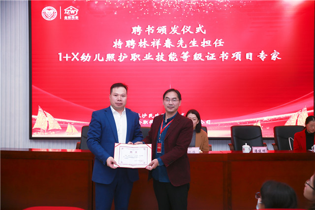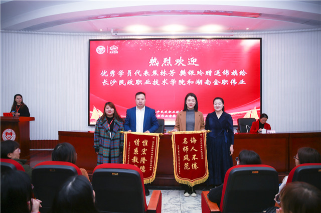 緊接著,湖南金職偉業(yè)集團(tuán)總裁潘建明為林祥春先生頒發(fā)聘書,特聘其擔(dān)任教育部1+X幼兒照護(hù)職業(yè)技能等級(jí)證書項(xiàng)目專家。本期優(yōu)秀學(xué)員代表為長(zhǎng)沙民政職業(yè)技術(shù)學(xué)院及湖南金職偉業(yè)集團(tuán)贈(zèng)予錦旗。