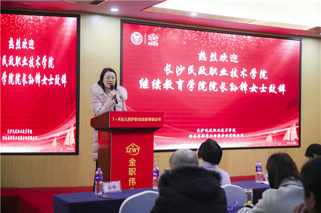 典禮伊始,長沙民政職業(yè)技術(shù)學(xué)院繼續(xù)教育學(xué)院院長孫鋒進(jìn)行致辭。她希望在今后各位專家教授能與金職偉業(yè)及長沙民政職業(yè)技術(shù)學(xué)院保持密切聯(lián)系,也希望大家能夠不斷推進(jìn)幼兒照護(hù)證書的落地實施,并為這一共同目標(biāo)努力奮斗。