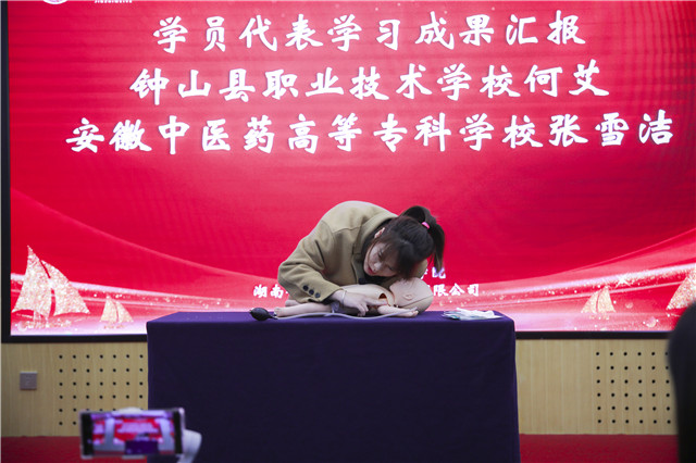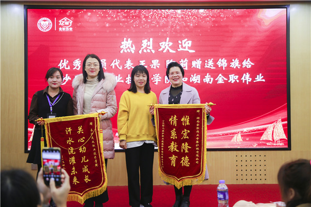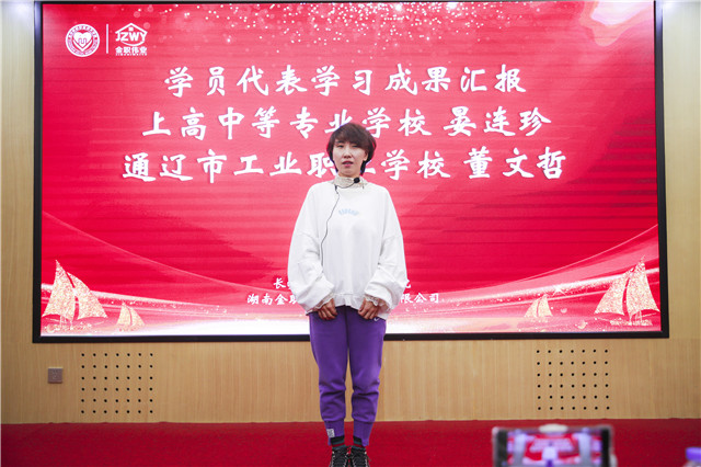 緊接著,本期優(yōu)秀學(xué)員代表昆明衛(wèi)生職業(yè)學(xué)院王果老師、鐘山縣職業(yè)技術(shù)學(xué)校陶莉老師為長沙民政職業(yè)技術(shù)學(xué)院及湖南金職偉業(yè)集團(tuán)贈予錦旗。