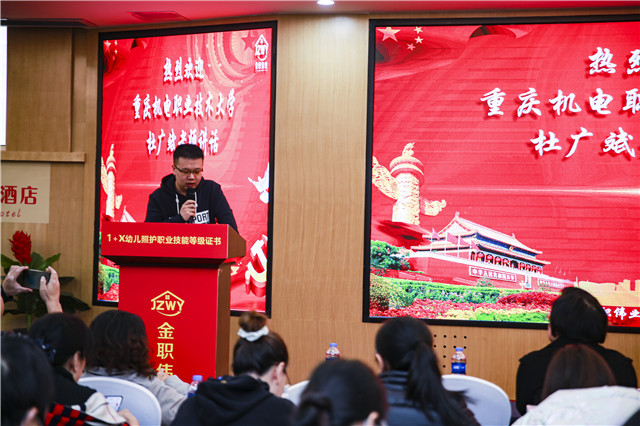 重慶機(jī)電職業(yè)技術(shù)大學(xué)健康與國際教育學(xué)院學(xué)前教育教研室主任杜廣彬老師作為學(xué)員代表發(fā)表感言。他首先簡單介紹了重慶機(jī)電職業(yè)技術(shù)大學(xué)的專業(yè)及師資實力,并對金職偉業(yè)提供此次督導(dǎo)員培訓(xùn)機(jī)會表示衷心地感謝。“在回校之后,我們會努力做好幼兒照護(hù)證書考試的督導(dǎo)員工作,遵守職業(yè)道德,嚴(yán)格按照督導(dǎo)要求執(zhí)行。”