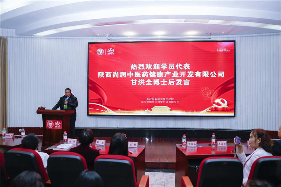 隨后,本期學員代表河南焦作師范高等專科學校學前教育學院趙雪利老師、杜利娜老師為長沙民政職業(yè)技術(shù)學院和湖南金職偉業(yè)母嬰護理有限公司贈予錦旗。