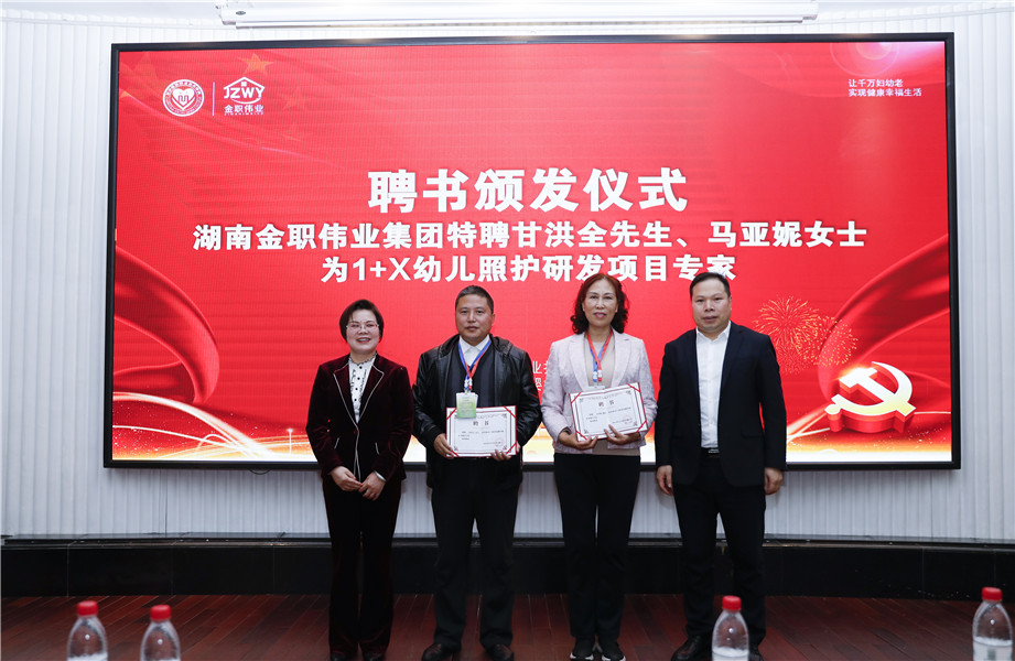 緊接著,現(xiàn)場頒發(fā)專家聘書,金職偉業(yè)聘請美國康涅狄格州立大學健康中心博士后、海派健康管理中心主任甘洪全,陜西師范大學體育保健學副教授、碩士生導師、北京大學昆侖商學院EMBA講師馬亞妮為“1+X幼兒照護職業(yè)技能等級證書專家”,并頒發(fā)聘書。