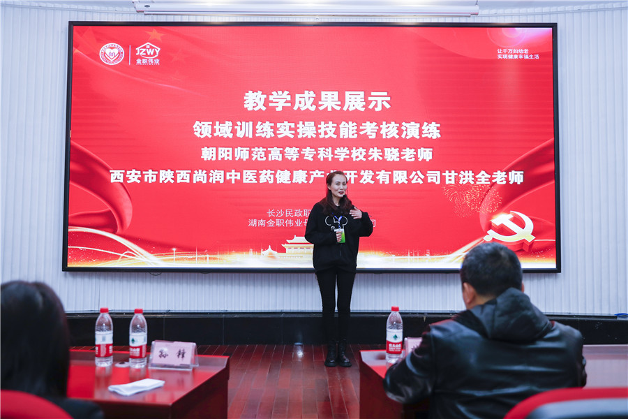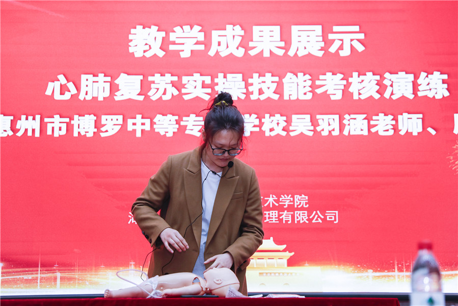 在成果匯報環(huán)節(jié)中上,優(yōu)秀學員代表廣東省惠州市博羅中等專業(yè)學校吳羽涵老師、廖衛(wèi)芳老師進行“心肺復蘇技術(shù)”實操及考評演示。朝陽師范高等專科學校朱驍老師,第三軍醫(yī)大學臨床醫(yī)學專業(yè)學士、第四軍醫(yī)大學醫(yī)學碩士、博士、美國康涅狄格州立大學健康中心博士后、海派健康管理中心主任甘洪全老師進行早教活動實操及考評演示。肇慶理工中等職業(yè)學校周鳳麗老師就本校本專業(yè)申報學生人數(shù)和實際情況,匯報分享了該校學生培訓與考證方案。