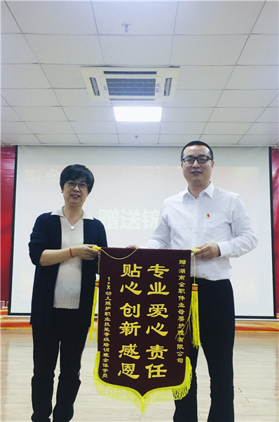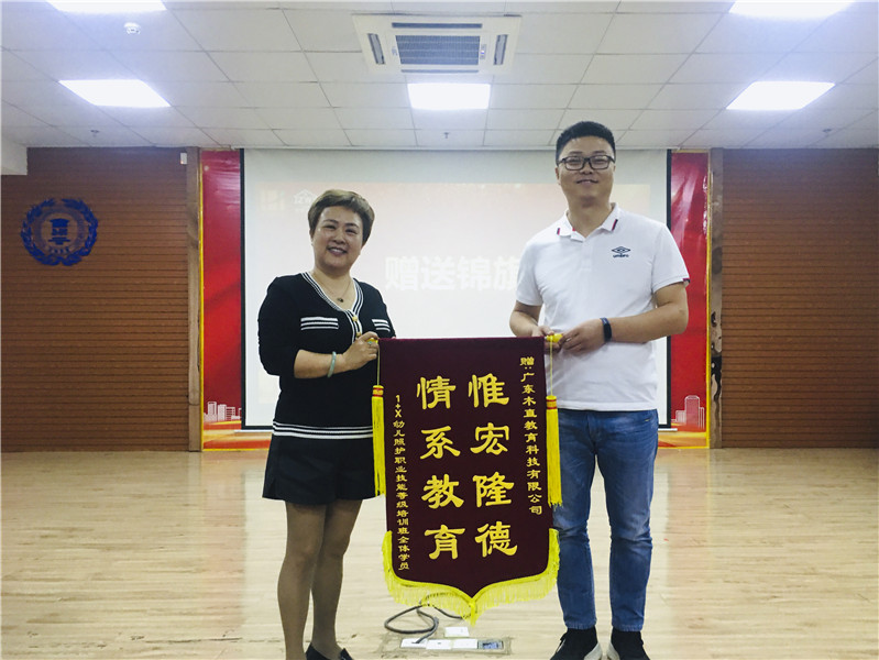 緊接著,李玲老師、黃斌老師作為全體學員代表為廣東木直教育集團和湖南金職偉業集團贈送錦旗。