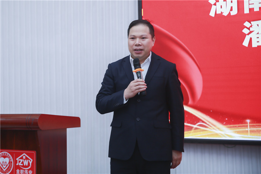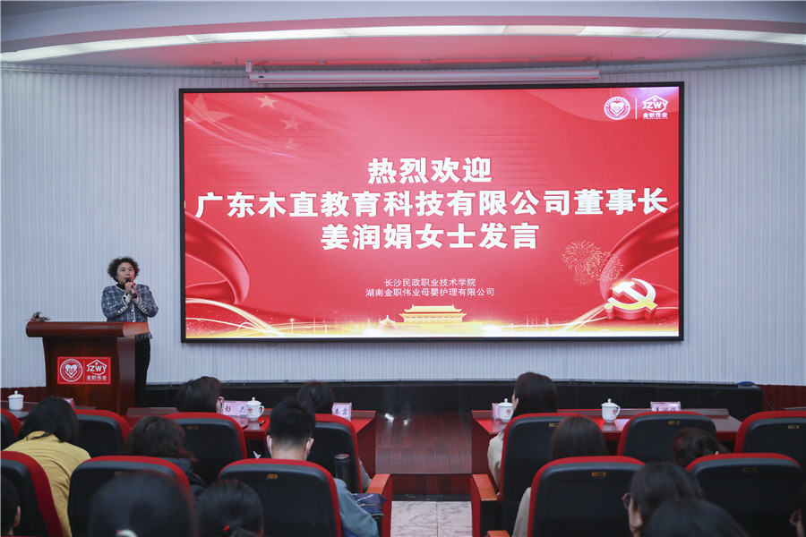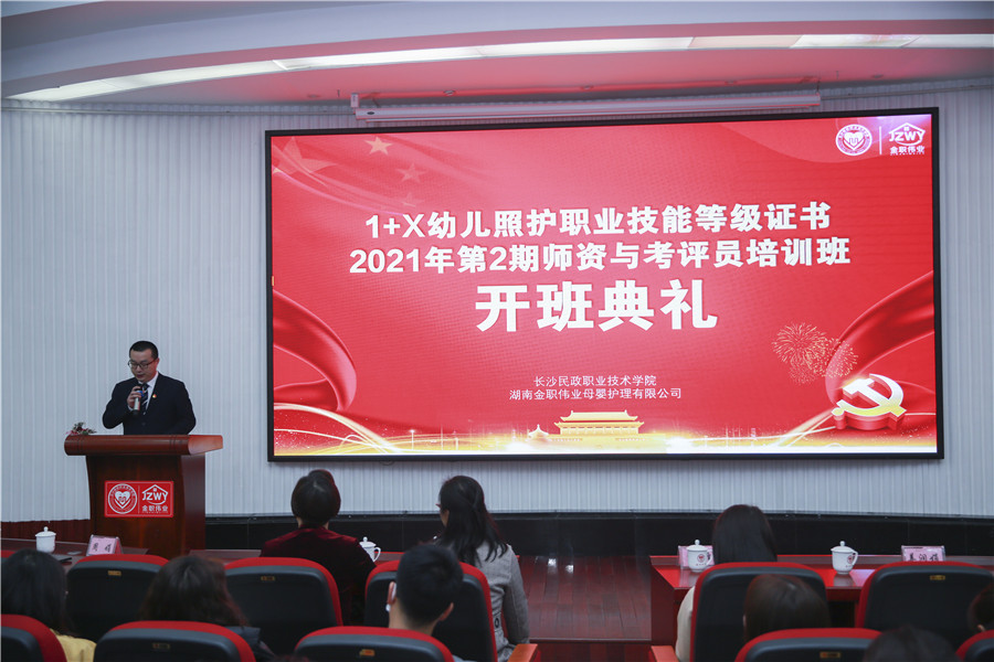 開班典禮由湖南金職偉業集團1+X項目部成員夏虎主持,長沙市民政職業技術學院副校長唐春霞、長沙民政職業技術學院繼續教育學院院長孫鋒、廣東木直教育科技有限公司董事長姜潤娟、湖南金職偉業集團董事長彭英、湖南金職偉業集團總經理潘建明、湖南金職偉業集團董事長助理兼品牌運營總監周娟一同出席本次典禮。