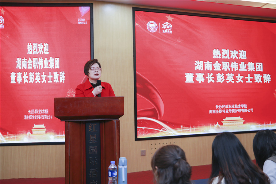 典禮伊始,湖南金職偉業集團董事長彭英進行開場致辭。她首先對各位專家老師的到來表示熱烈歡迎,并表示為了進一步推進幼兒照護考務工作,確保幼兒照護證書考評工作的如期完成,特舉辦此次培訓。隨后,彭英對金職偉業在幼兒照護工作上取得的一系列成果進行總結匯報,“截止2020年12月,金職偉業共開設1+X幼兒照護職業技能等級證書師資及考評員培訓27期、考務技術員培訓6期、督導員培訓6期,共培訓5000余人次。”