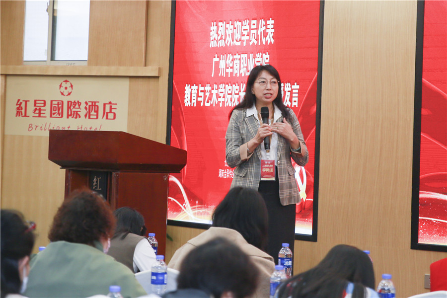 隨后,廣州華商職業學院教育與藝術學院院長劉玉娟教授作為此次考務技術員與督導員培訓班學員代表上臺發言。她首先對于金職偉業提供此次培訓學習平臺表示誠摯感謝,并對廣州華商職業學院進行了具體介紹。“我們學校去年就有組織幼兒照護職業技能等級證書的考試,通過率很高,我也希望未來能有更多學生拿到幼兒照護證書,為托育托幼行業增添新的力量。”