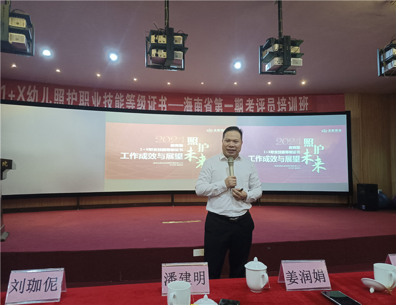 為貫徹落實全國職業教育大會精神,深化產教融合、校企合作,深入推進育人方式、辦學模式、管理體制,4月17日上午,1+X幼兒照護職業技能等級證書海南社會培訓基地首期社會考評員培訓在海南職業技術學院順利開班,來自海南當地的近50位幼兒園及托育機構負責人齊聚一堂,共同學習幼兒照護相關考評知識、探討幼兒照護事業未來發展前景。