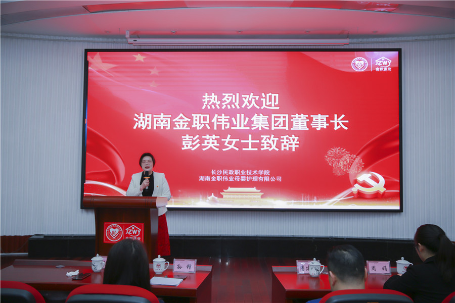 湖南金職偉業集團董事長彭英發表講話,她提到金職偉業作為1+X第三批幼兒照護職業技能等級證書職業教育培訓評價組織,將充分發揮幼兒照護職業技能等級證書對學校、教師、學生、企業的作用,實現國家職業教育的改革創新:對學校,國家重點支持“各地中、高職院校開展1+X證書制度試點,匹配相對應的資金補貼;對教師,將在座的每一位老師打造成為1+X幼兒照護雙師資型老師,在回校后引領和推進幼兒照護證書實施、落地;對學生,提升就業能力,拓寬就業面;對企業,金職偉業作為湖南省第一批擬建設培育產教融合型企業,將積極引領、打造更多產教融合型企業。最后,彭英表示,2021年是十四五開局之年,我國將開啟全面建設社會主義現代化國家新征程,金職偉業將以習近平新時代中國特色社會主義思想為指導,堅持為黨育人,以突出成績喜迎中國共產黨建黨100周年。